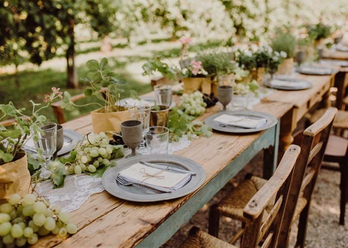 Elements and colors of the earth are in the foreground: raw wood and green vegetation are combined with natural fabrics (cotton, canvas, jute) and white, ivory or ecru shades. The mise en place, in perfect green style, is basically informal on imperial wooden tables, left naked and decorated with long runners together with natural elements. Zero environmental impact is the goal of sustainable weddings and this also influences the floral choice: flower pots or arrangements with fake flowers are preferred to centerpieces with flowers grown in greenhouses, cut and imported from abroad. Hand-made decorative elements and solidarity favors help to make the wedding a friend of nature.