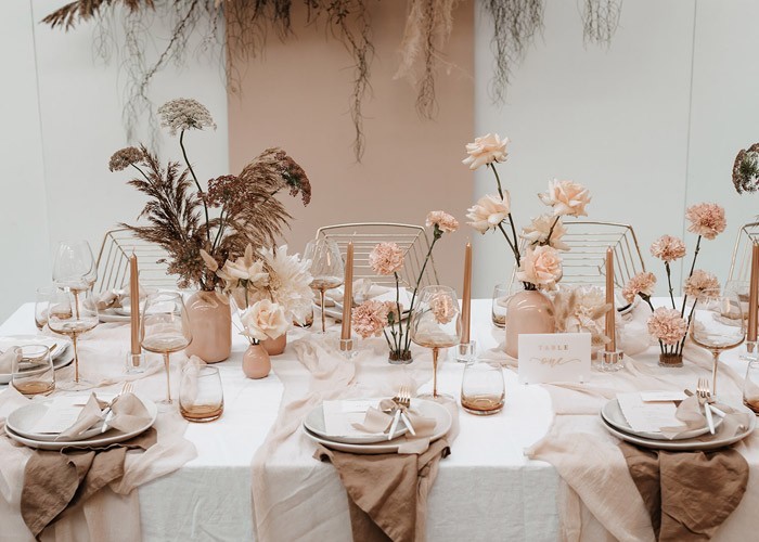Pastels colors and white are protagonists with a moderate use of intense shades and chrome details. So give space to stationery elements with a slight touch of color and stylized or almost absent graphic motifs. Even the floral arrangement must remain faithful to the style and flowers contribute to create something innovative. Arrangements do not exceed in flowers or foliage and they follow precise lines appropriate to the minimalist concept. One of the latest trends is the use of dried flowers to be used alone or dried floral elements to combine with classic cut flowers.
